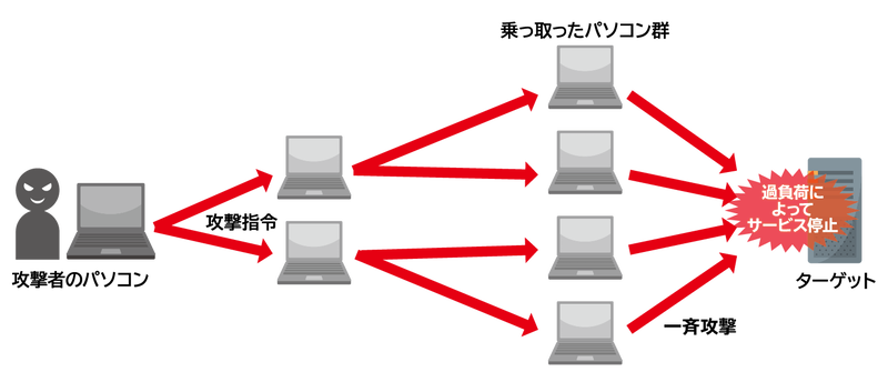 攻撃者があらかじめ不正に乗っ取った端末から一斉に攻撃を仕掛けます。数万台~数十万台のパソコンを利用した攻撃の事例もあります。最近ではパソコンだけでなく、テレビやネットワークカメラなどインターネットに接続できるデジタル情報家電なども攻撃されています。