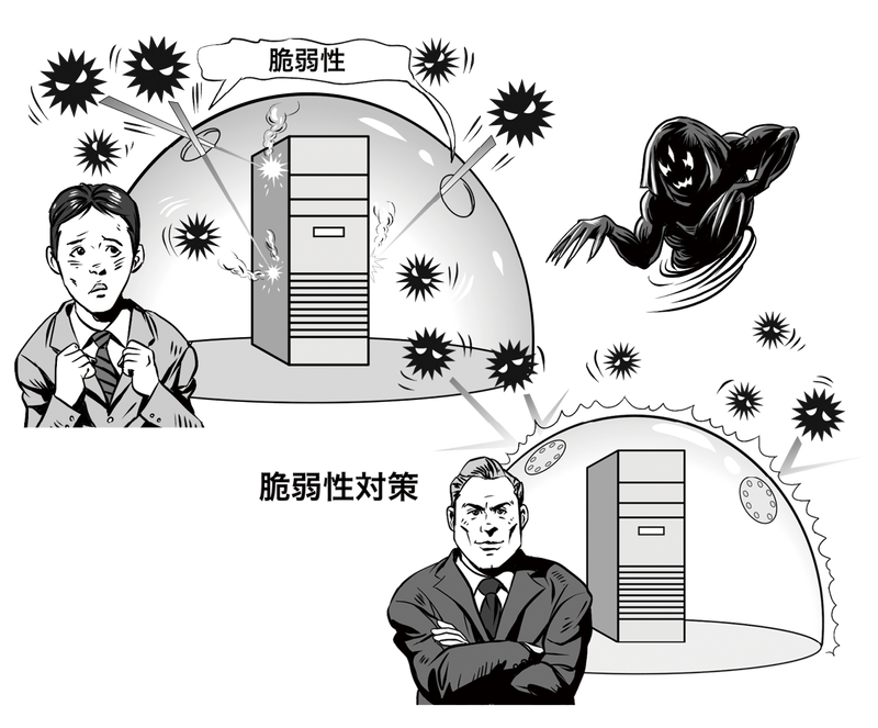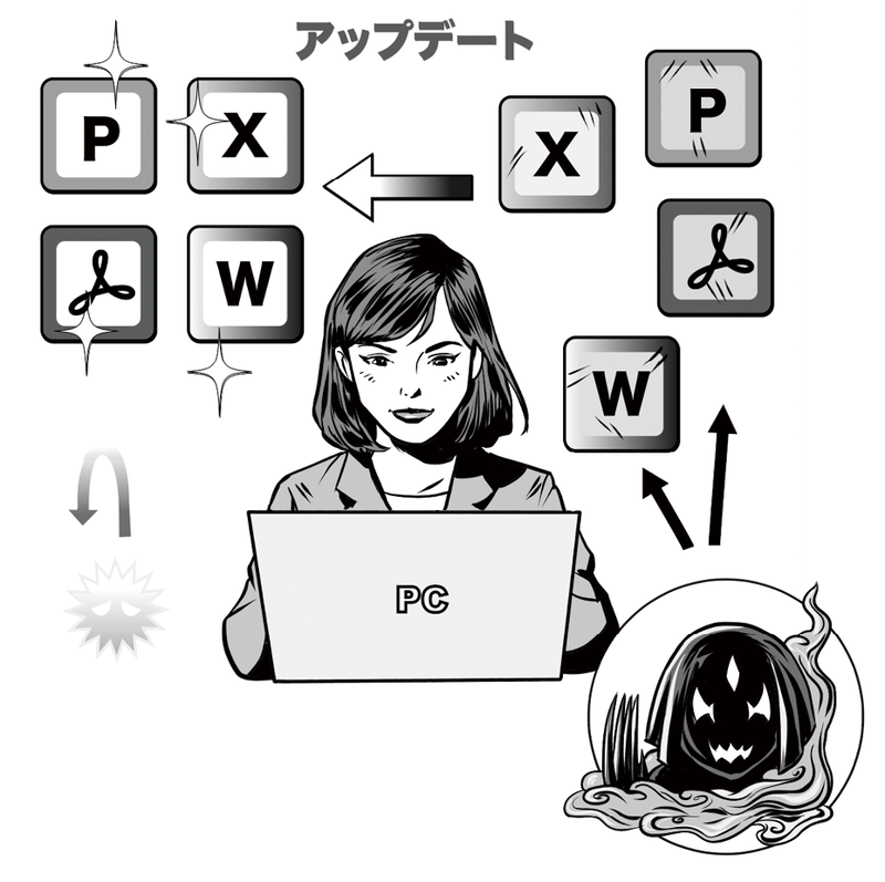 OSやソフトウェアの脆弱性が発見されると、開発したメーカーから更新プログラムが提供されます。攻撃者は、更新プログラムを実施していない利用者を探し出し、攻撃を仕掛けます。