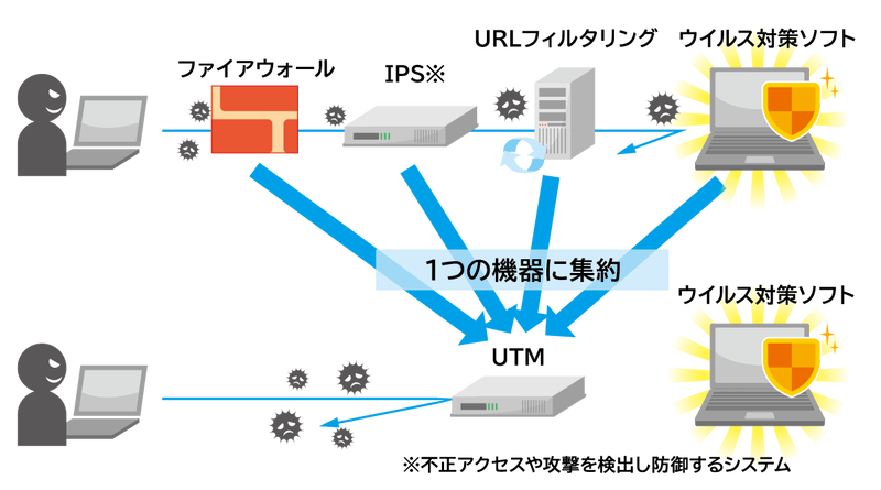 オフィスのネットワークとインターネット網との間の出入り口部分に、統合型セキュリティ機器( UTM)を導入することで、二重にセキュリティを強め外部への情報漏えいや被害拡大を防ぐことができます。UTMは複数のセキュリティ機能を1つのハードウェアに統合し、集中的に管理します。
