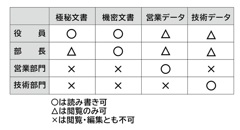 例えば「社外秘」の情報はアクセスできる利用者も制限する必要があります。つまり、この情報を利用できるのは誰かを決め、それ以外の人は利用不可とするのがアクセス権の設定です。