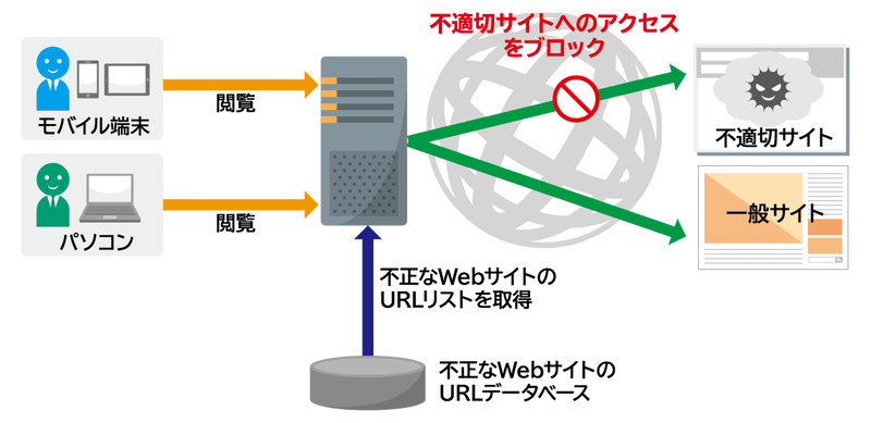 フィッシングサイトやウイルスを配布するような不正なWebサイトのアドレスをURLデータベースから取得し、Web(URL)のフィルタリングを行うことで、アクセスを制限します。