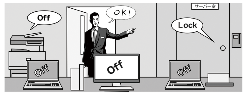 ●全員のパソコンがシャットダウンされ、プリンターなど周辺機器の電源が切られているか確認する。