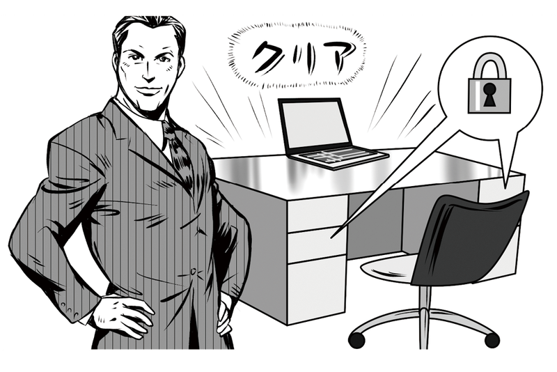 机の上に放置した情報は、誰かに持ち去られたり、盗み見られたりする危険にさらされています。関係者以外が見たり、触れたりすることができないように、重要情報は放置せず、一元管理する必要があります。保管場所を定め、作業に必要な場合のみ持ち出し、終了後に戻すようにしましょう。