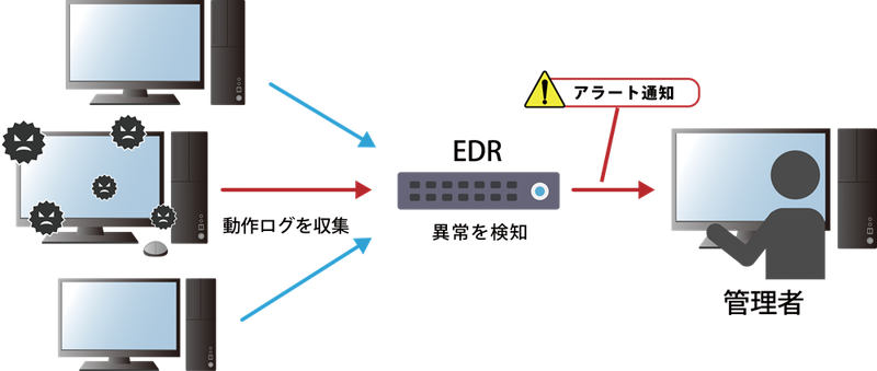 また、EDRというシステムでは、PCやスマートフォン、サーバーなどのネットワークに接続されている末端機器(エンドポイント)における 不審な動作を検知できます。