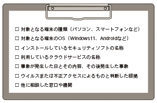 サイバー攻撃を受けた可能性がある場合は、事前に次のような情報を整理して緊急連絡先に連絡しましょう。