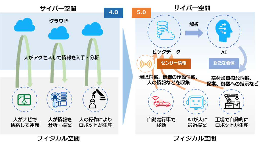 これまでの情報社会(Society4.0)では、人がサイバー空間にあるクラウドサービスにアクセスすることで、情報やデータを入手し、分析を行ってきました。Society5.0では、フィジカル空間のセンサーから膨大な情報がサイバー空間に集積されます。サイバー空間では、この集積されたデータ(ビッグデータ)を人工知能(AI)が解析し、その結果をフィジカル空間の人間にさまざまな形で、フィードバックしていきます。今までの情報社会では、人間が情報を解析することで、価値が生まれましたが、Society5.0では、AIが解析した膨大なビッグデータの結果がロボットなどを通して、人間にフィードバックされることで、これまでに実現しなかった新たな価値が産業や社会にもたらされます。[3]