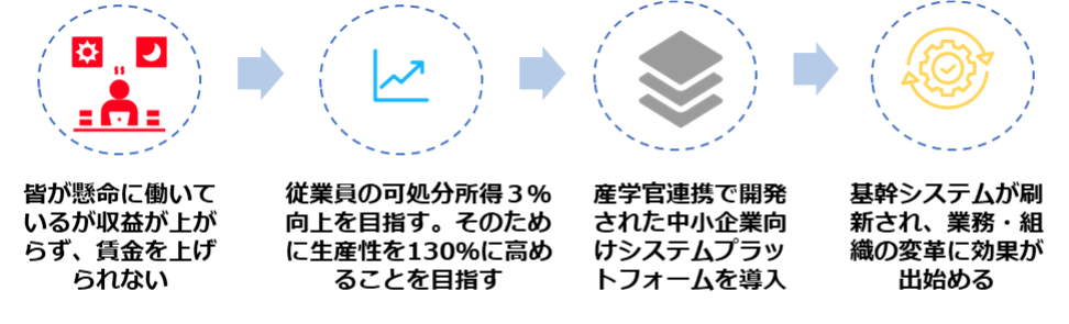 | 産学官連携で開発された中小企業向けの共通業務システムプラットフォームを導入し、長年の業務を支えた基幹システムを刷新しました。その結果、無駄な業務や無理な計画などが判明したことに加えて、各部署のデータがつながるようになりました。これにより、各部署がそれぞれ自部署のことのみを考えていた状態から、他部署に正しいデータを流さなければならないという意識が生まれました。全社で「正しいデータ」を集める意識を持つ企業文化への変革に効果が出始めました。 |