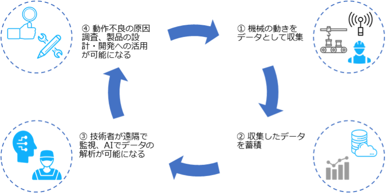 | 製造現場の加工機にセンサーを設置して、機械の動作を非常に細かい間隔でデータ収集・可視化できる製品を開発しました。また、取得したデータを専門技術者が遠隔で確認し、動作不良の原因調査や製品の適切な使用方法のアドバイスを実施したり、AIによるデータ解析によって使いやすい製品の設計・開発に活用したりすることが可能となりました。 |
