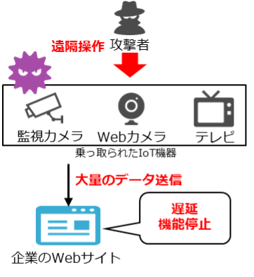 最近、IoTデバイスを標的にしたマルウェアが広まっています。このマルウェアに感染した大量のIoT機器は、攻撃者によって遠隔操作され、大規模なDDoS攻撃に利用されます。企業がDDoS攻撃を受けると、自社のWebサイトが遅延したり、機能停止したりすることがあります。そして、攻撃を停止することと引き換えに、攻撃者から金銭を要求されることもあります。このような攻撃に対抗するためには、Webアプリケーションへの攻撃を防ぐためのWAF(Webアプリケーションファイアウォール)や、ネットワーク上の攻撃を防御するためのIPS(Intrusion Prevention System)の導入が考えられます。