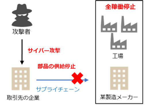 某メーカーの取引先企業がサイバー攻撃を受け、システムが使用不能になりました。この攻撃により、某メーカーは部品の調達が不可能になり、その結果、複数の工場が停止し、数万個以上の生産が見送られる事態に陥りました。この出来事は、サプライチェーン攻撃のリスクとその被害の大きさを再認識させる上で非常に重要な事例となりました。 |