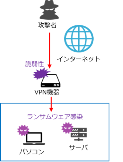 ⚫︎ VPN装置は外部のネットワークからアクセス可能な位置に設置されることが多く、外部の攻撃者から攻撃されやすくなります。そのため、VPN装置のベンダーのWebサイトなどを確認し、未対策の脆弱性がないかを点検することが大切です。 ⚫︎ サイバー攻撃の被害は取引先企業に広がることがあります。セキュリティ対策は自社に加えて、サプライチェーンでつながっている会社、取引先企業を含めて考え、実施する必要があります。 |