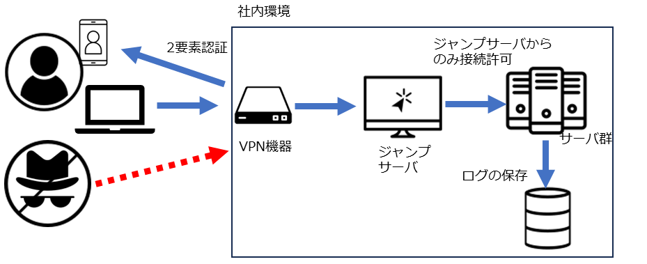 ランサムウェア被害のケースを見ると、VPN機器から不正侵入され、サーバーの特権IDを使用してサーバーのデスクトップ上から不正プログラムを実行されるケースが後を絶ちません。セキュリティ対策、運用については、まず、VPNで接続するためのインターネットとの接点を絞りこみ、接続してくる者の身元を確認し、本人であることを証明させる多要素認証の仕組みを講じることが必要となります。それ以外にも、特定のPCやサーバーからしか重要なサーバーのデスクトップに接続できないような仕組みや、ログの長期保管なども重要な要素となります。