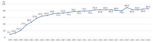 日々の生活や企業活動において、ITの活用は広範囲にわたって浸透しています。インターネット利用率(個人)は平成9年には9.2%でしたが、令和5年には86.2%まで上昇しました。急速なITの普及により、現実社会とサイバー空間が密接に結びつき、私たちの生活やビジネスに大きな変革変化をもたらしています。