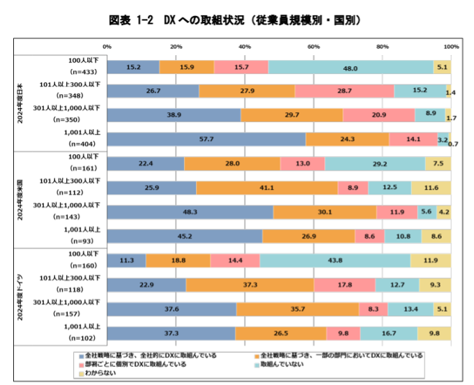 | 日本でDXに取り組んでいる企業の割合は、77.8%であり、2022年の69.3%と比較すると着実にDXが企業に浸透しています。しかし、DXに取り組んでいる企業の割合を従業員規模別に見ると、日本の「1,001 人以上」の企業において DX に取組んでいる割合は96.1%、同「100人以下」の企業においては 46.8%であり、2 倍以上の差があります。日本では、従業員規模が大きいほど、DX の取組みが進んでいますが、米国、ドイツは「301 人以上 1,000 人以下」の企業が最も DX に取組んでいる割合が高いため、日本の中小企業における DX の取組の少なさは依然として大きな課題となっているといえます。 |