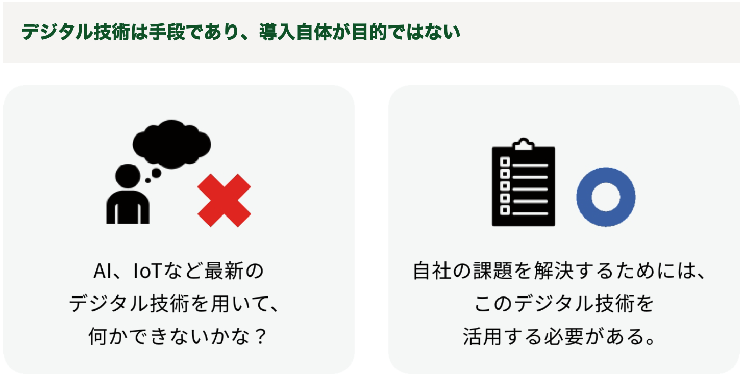 DXを推進していく際、ただ単にデジタル技術を導入すれば良いというわけではありません。自社の実現したいこと(将来のビジョン)から、実現に必要な課題を明確にし、その課題を解決するためにデジタル技術の活用が求められます。現在は、AI、IoTなど新しいデジタル技術が多くあります。