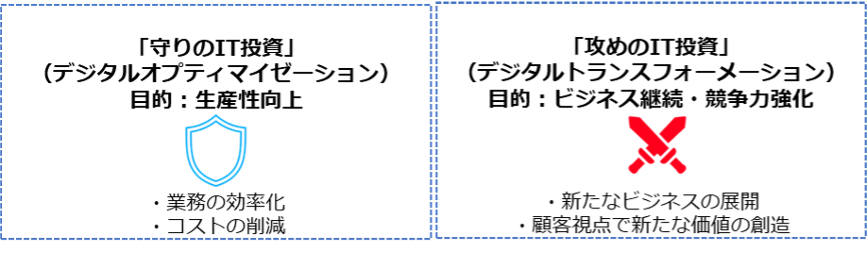 業務効率化やコスト削減のためにデジタル技術やツールに投資する「守りのIT投資」に加えて、デジタル技術を用いて、ビジネスモデルを変革したり、顧客視点で新たな価値を創出したりするDXを推進させるため、「攻めのIT投資」を行うことが必要です。