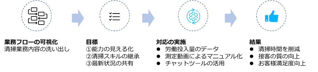 清掃作業がうまい人を動画にし、具体的な手順を可視化・マニュアル化 チャットツールを使って従業員同士の清掃状況の共有 |
