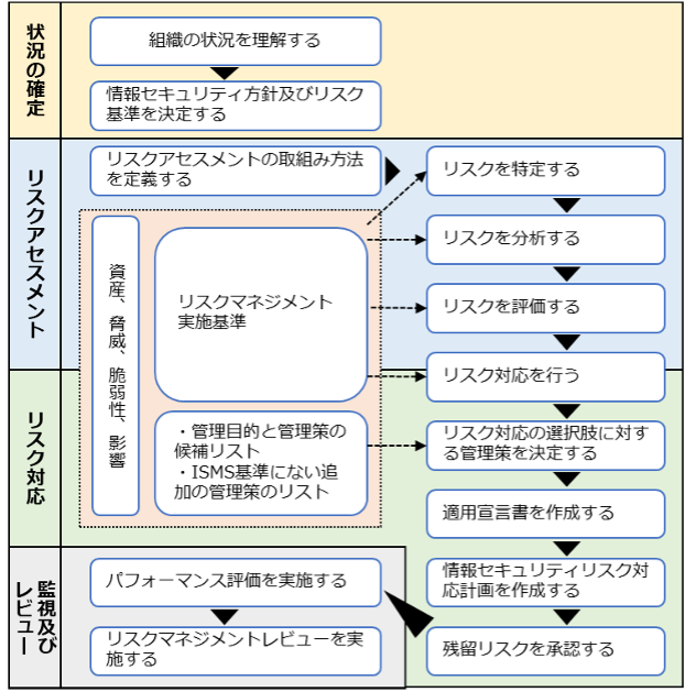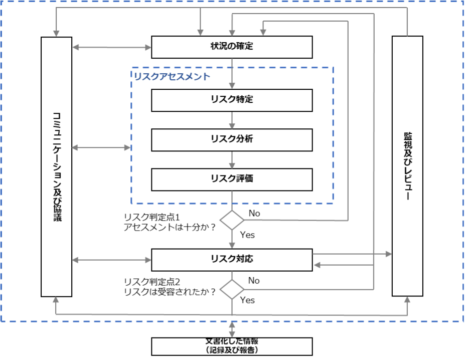 「コミュニケーション及び協議」「適用範囲、組織の状況及び基準」「リスクアセスメント」「リスク対応」「モニタリング及びレビュー」「記録作成及び報告」で構成されています。 |
