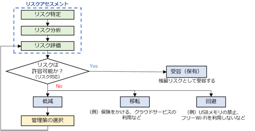 リスクアセスメントからリスク対応までの流れを表す図を記載します。リスク対応を実施する過程では、「低減」「移転」「回避」「受容(保有)」の4つ選択があり、それらの選択は以下の図で示すプロセスで行われます。