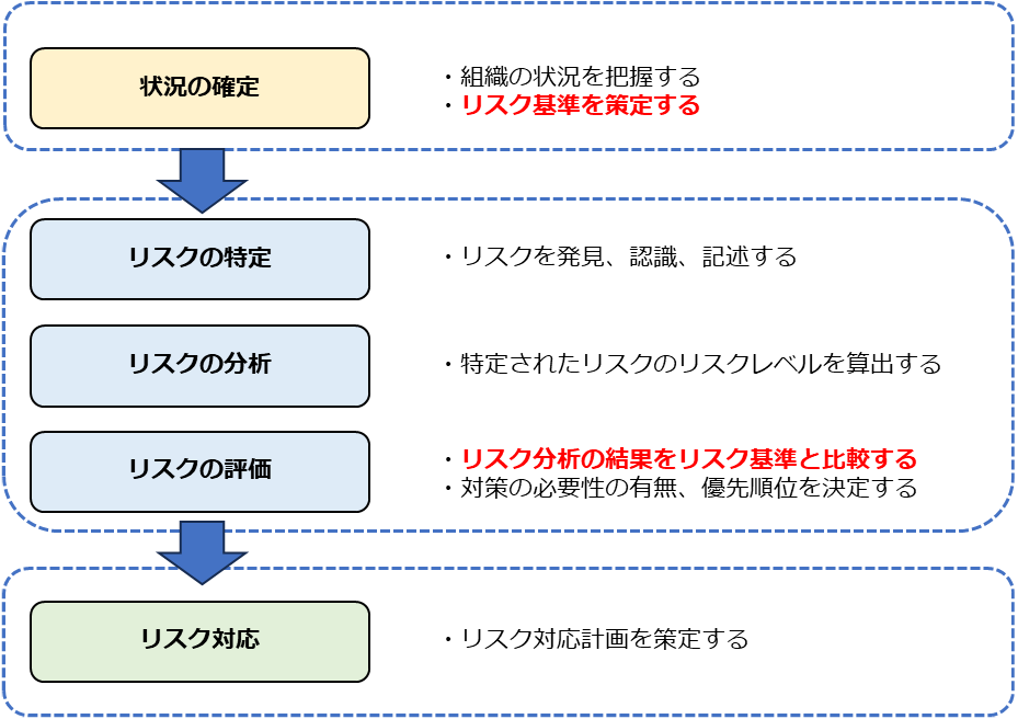 リスクアセスメントを実施するにあたって、リスクの重大性を評価するための目安となる条件を決める必要があります。その条件のことをリスク基準と言います。ISMSでは、リスク基準に「リスク受容基準」と「情報セキュリティリスクアセスメントを実施するための基準」を含むよう明示されています。