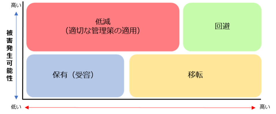 また、情報セキュリティリスクの場合、以下の図で示す考え方をすることが多いです。以下の図では、発生頻度が高く被害が非常に大きいものについては「回避」、発生頻度は低いが被害が大きいものについては「移転」、発生頻度は高いが被害が大きくないものについては「低減」を検討するという考え方を示しています。
