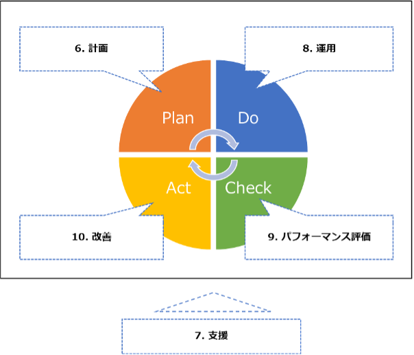 ISO/IEC 27001では、組織が効率的にISMSの構築・実施・維持・継続的改善を行うとともに、情報セキュリティのリスクアセスメントおよびリスク対応を実現するために必要な要求事項を定めています。ISO/IEC 27001の要求事項は、ISMS認証を取得するには必ず対応しなければなりません。どのような内容が要求されているのか認識するため、各要求事項の概要について説明します。要求事項は、後述のPDCAサイクルと呼ばれる運用サイクルに落とし込むことにより、情報セキュリティマネジメントを実施することになります。