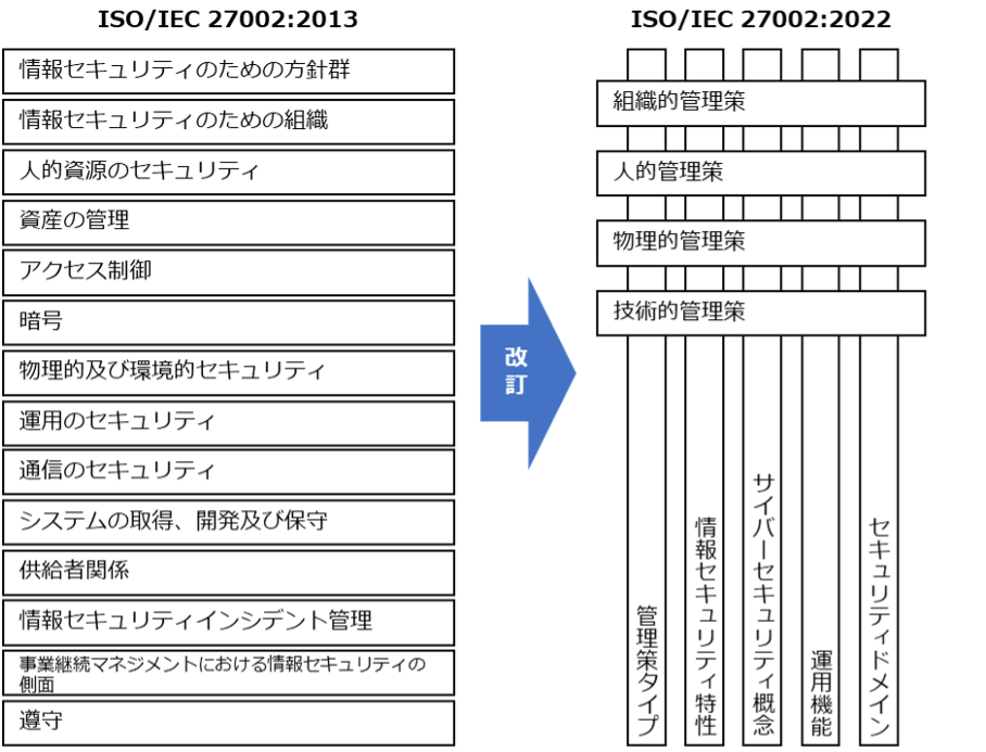 ISO/IEC 27002は、2022年に改訂がありました。その際の変更点としては、管理策の項目数と章立ての変更、テーマおよび属性の導入、全管理策に目的を追加などがあります。管理策の数は、2013年版では14分野114項目でしたが、2022年版ではいくつかが統合されて82項目になり、新しく11項目が追加され、合計で93項目となりました。