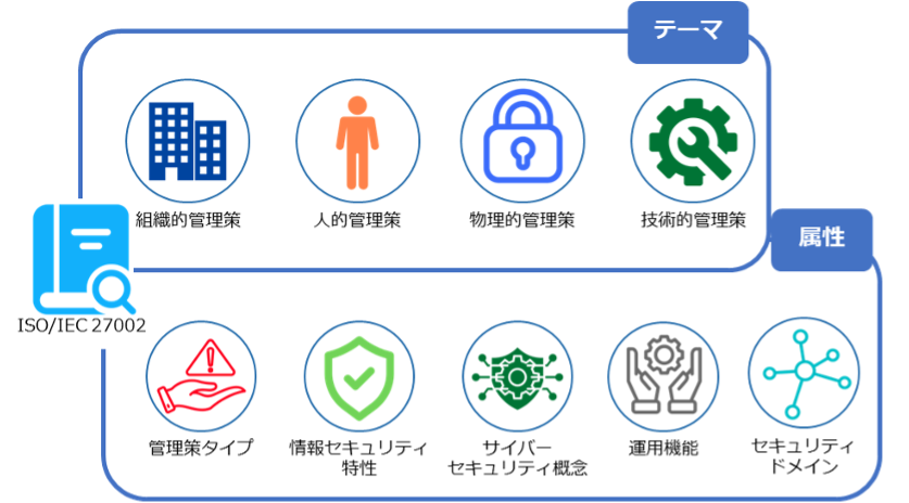 ISO/IEC 27002の箇条5~8に示される4種の管理策での分類(組織的・人的・物理的・技術的)を、テーマと呼びます。管理策の分類はさまざまな考え方がありますが、多くの組織に共通であると考えられる最低限の分類としてこの4つが採用されています。テーマとは別の視点で、より細かに管理策を見るのに際しては、属性という機能があります。各管理策に属性が付与されたことにより、検索性が向上し、管理策のフィルタリング、並び替え、提示がしやすくなりました。