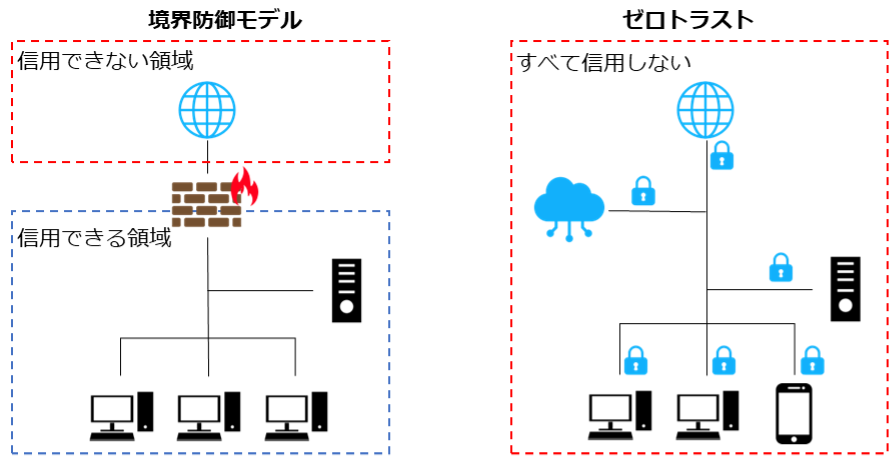 一方、ゼロトラストは、「境界」の概念をなくし、守るべき情報資産にアクセスするものはすべて確認し、認証・認可を行うことで脅威を防ぐという考え方です。