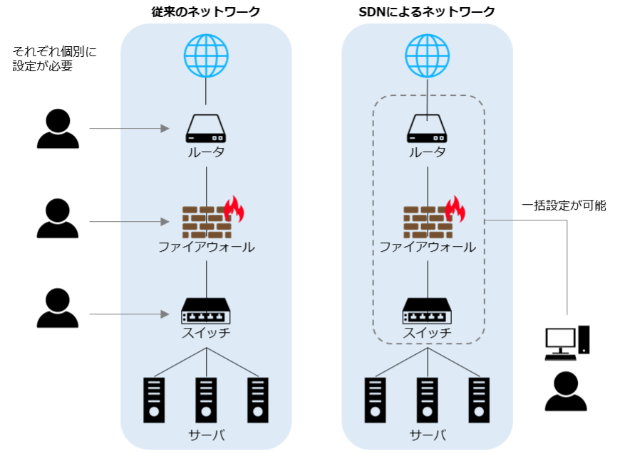 SD-WANとは、ネットワークをソフトウェアで制御するSDNを、物理的なネットワーク機器で構築したWANに適用する技術のことです。企業の拠点間接続や、クラウド接続などにおいて柔軟なネットワーク構成を実現したり、ネットワーク上で発生する通信を適切に制御したりすることができます。