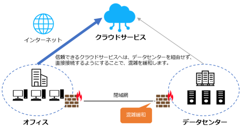 例えば、拠点間の通信には閉域網(不特定多数のユーザーが利用するインターネットとは異なり、関係者のみが接続できる通信回線)を使用し、信頼できるクラウドサービスには直接外部インターネットへ接続するように切り替えることで、トラフィックの最適化が行えます。