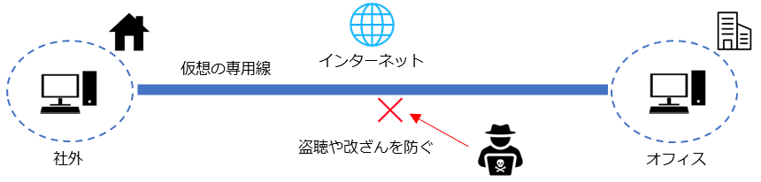 インターネット上で安全性の高い通信を実現するための手法です。通信データを暗号化し、送信元から送信先までの通信を保護することで、盗聴やデータの改ざんを防ぎます。VPNを使用することで、ユーザーは物理的な専用線で通信しているかのような安全な通信を行えます。
