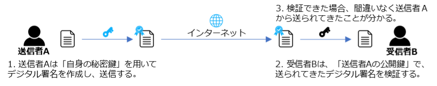 デジタル署名では公開鍵と秘密鍵、2つの鍵を使用します。公開鍵は公開される誰でも取得できる鍵で、秘密鍵は本人だけが保持している鍵です。秘密鍵で署名したデータは、対となる公開鍵で検証できます。この仕組みを利用し、受信者は送られてきたデータが間違いなく送信者本人から送られてきたか確認できます。
