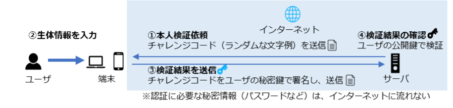 ⚫︎ 認証に必要な秘密情報(秘密鍵)は、認証を行う端末側のみに保存され、利用する際は指紋認証や顔認証などによって本人確認を行うため、パスワードを覚える必要がありません。