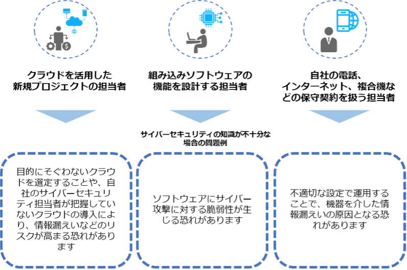 企業は、デジタルトランスフォーメーションの推進と並行してサイバーセキュリティへの対策が求められています。この状況の中、経営層をはじめ、法務や広報といった、必ずしもITやセキュリティに関する専門知識や業務経験を有していない人も「プラス・セキュリティ」知識を習得することが重要です。なぜなら、デジタルトランスフォーメーションが進む中、サイバーセキュリティ担当部署だけでは、サイバーセキュリティ対策への対処が難しい状況になっているためです。そのため、サイバーセキュリティ対策が不十分な場合、インシデントが生じる可能性がある業務を担っている人材には、業務に必要なセキュリティに関する知識・スキルを身につけてもらう必要があります。