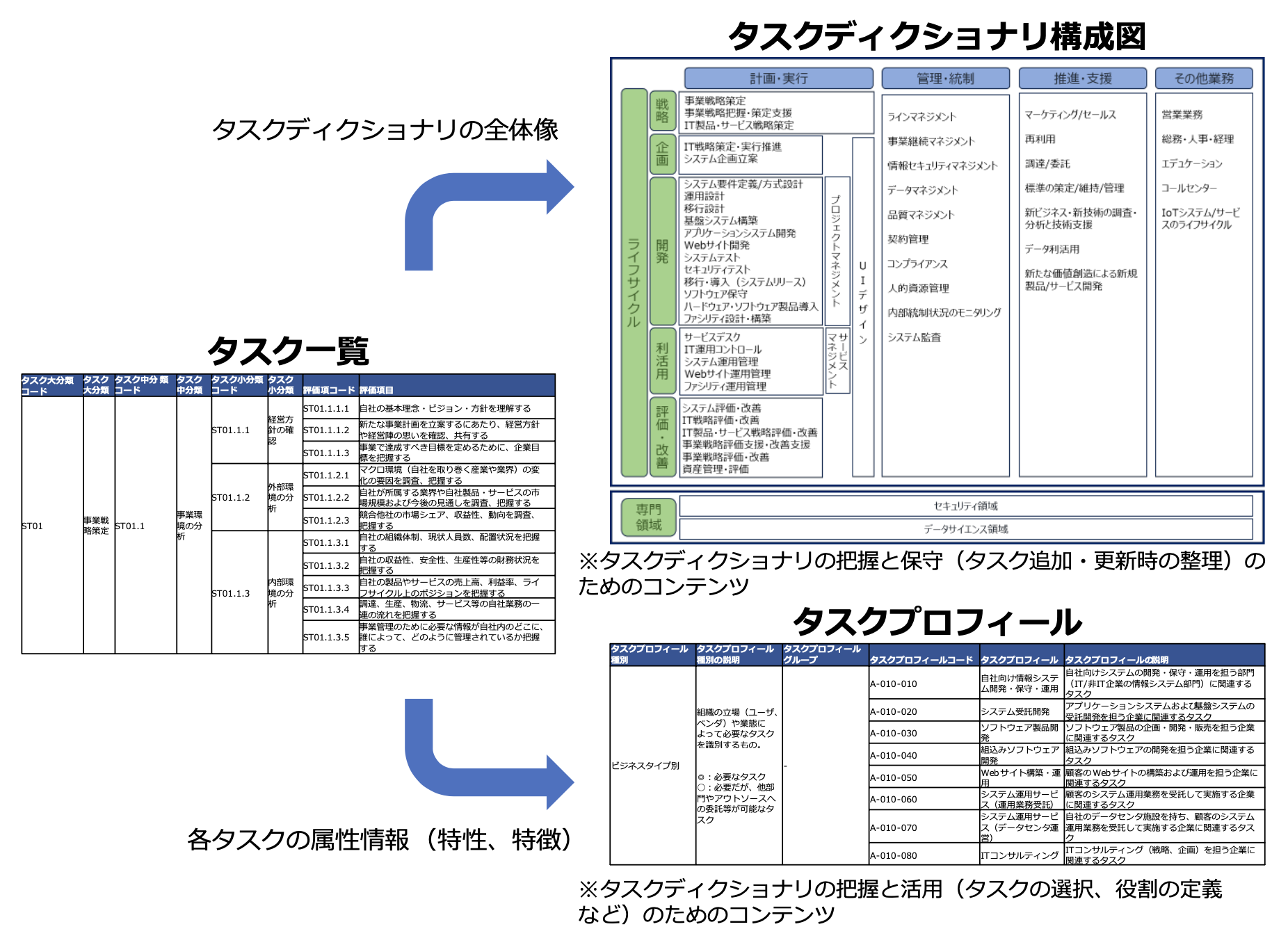 タスクディクショナリには、「タスクディクショナリ構成図」、「タスクプロフィール」が含まれ ており、自タスクを策定する際の参考情報として利用することを想定しています。