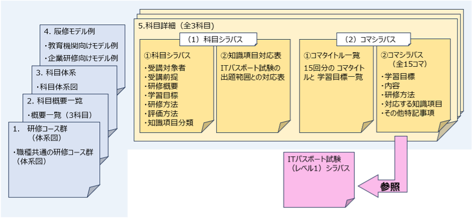 ⚫︎ ITパスポート試験の出題範囲と整合し、科目およびコマシラバスごとに知識項目との対応が明らかになっているので、「ITパスポート試験(レベル1)シラバス」と併用することでより一層の研修効果を図ることができます。 |