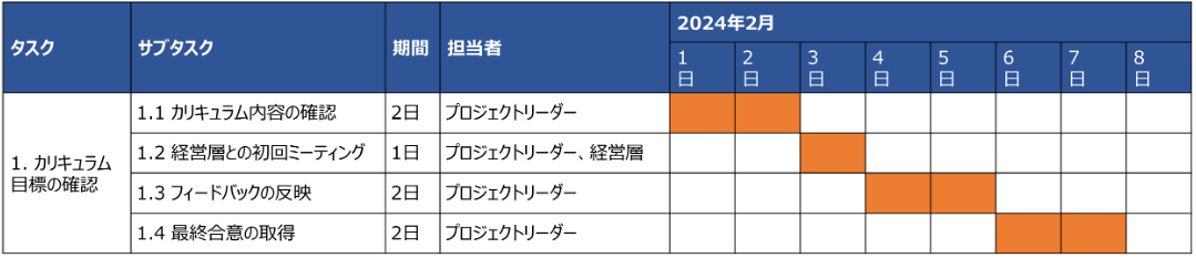 | 4.2 学習スケジュールの通知 | 1日 | 人事部 | 受講者にスケジュールを周知 | ||