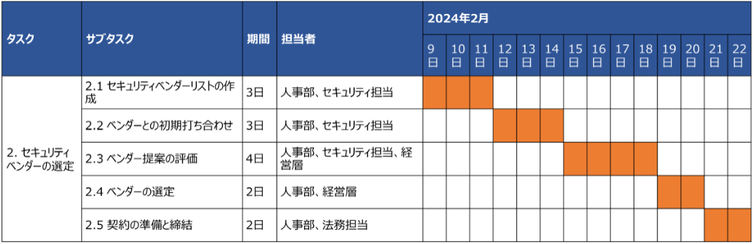 | ステップ2:外部パートナーの選定 | 2. セキュリティベンダーの選定 | 2.1 セキュリティベンダーリストの作成 | 3日 | 人事部、セキュリティ担当 | ベンダー候補をリスト化 |