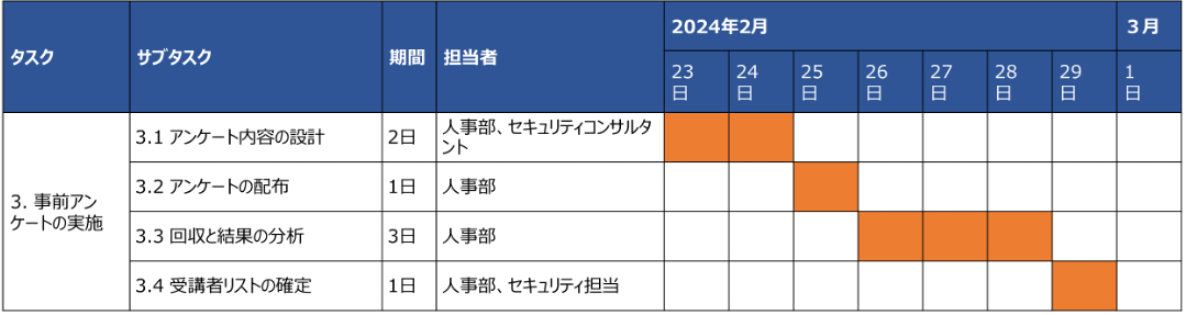 | ステップ3:受講者の準備 | 3. 事前アンケートの実施 | 3.1 アンケート内容の設計 | 2日 | 人事部、セキュリティコンサルタント | セルフチェックリストの作成 |