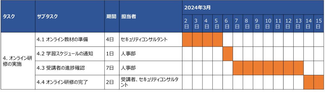 | ステップ4:カリキュラムの実施 | 4. オンライン研修の実施 | 4.1 オンライン教材の準備 | 4日 | セキュリティコンサルタント | オンデマンド形式の教材準備 |