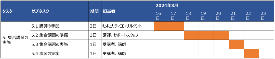 | 5. 集合講習の実施 | 5.1 講師の手配 | 2日 | セキュリティコンサルタント | 集合講習を担当する講師を確定 | |