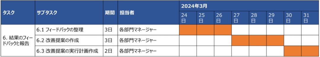 | 6.2 改善提案の作成 | 3日 | 各部門マネージャー | 改善提案を作成 | ||