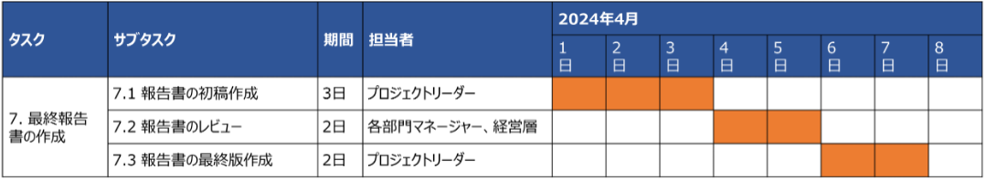 | 7.3 報告書の最終版作成 | 2日 | プロジェクトリーダー | 最終報告書を経営層に提出 |