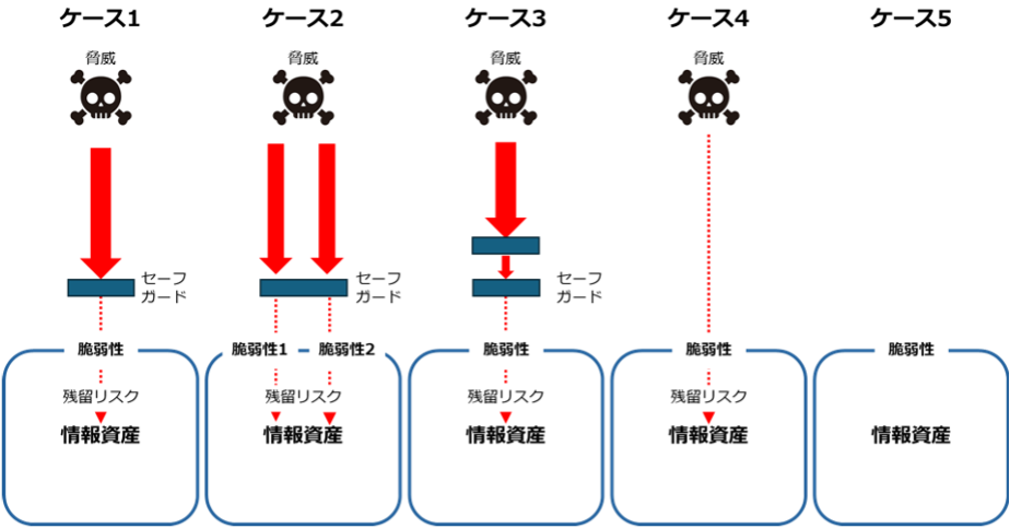 脅威、脆弱性、情報資産、セーフガード(管理策)、リスクの関係をわかりやすく図で表すと以下のようになります。