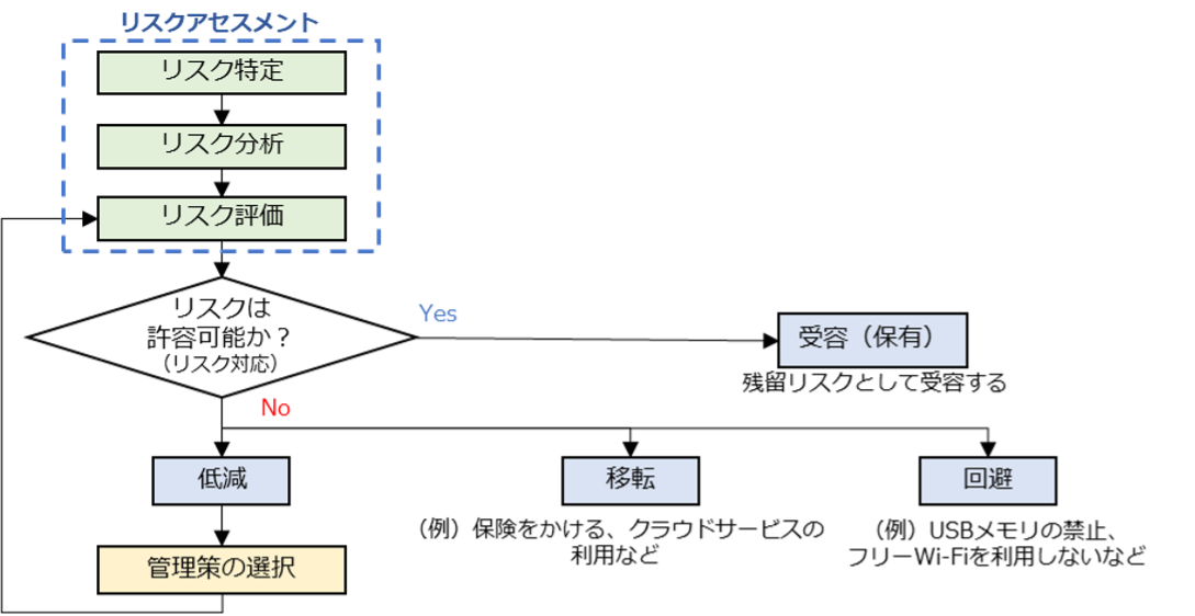 ⚫︎ リスクアセスメントは「リスク特定」、「リスク分析」、「リスク評価」を実施すること。 ⚫︎ リスク対応はリスクアセスメントの結果をもとに「リスク回避」、「リスク低減」、「リスク移転」、「リスク受容」から選択すること。 |