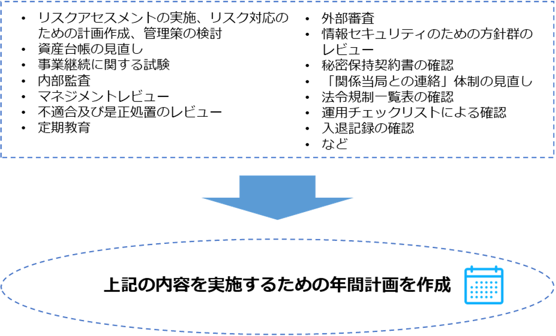 担当者がその役割・責任において次のような事項を実施します。これらの事項を実行するため、年間計画を作成します。